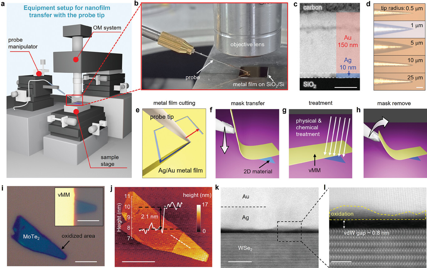 在本研究中,我們提出了一種稱為"光學顯微鏡下探針轉移-范德華金屬掩模"(PVOM)的新方法,用于實現(xiàn)無殘留、全固態(tài)的二維材料工程,以實現(xiàn)局部區(qū)域處理和多種電子器件制備。轉移的金屬薄膜由厚度分別為10 nm和150 nm的Ag/Au組成,作為范德華金屬掩模(vMM)。值得注意的是,該掩模采用鎢探針尖端進行轉移,整個過程不涉及任何有機聚合物和溶劑。截面掃描透射電子顯微鏡(STEM)分析顯示,金屬薄膜下方存在1-2 nm的氧化層,以及0.8 nm的較大范德華間隙,這提供了適當?shù)姆兜氯A力,使掩模能夠緊密附著樣品,同時也能在不損傷二維材料的情況下移除掩模。